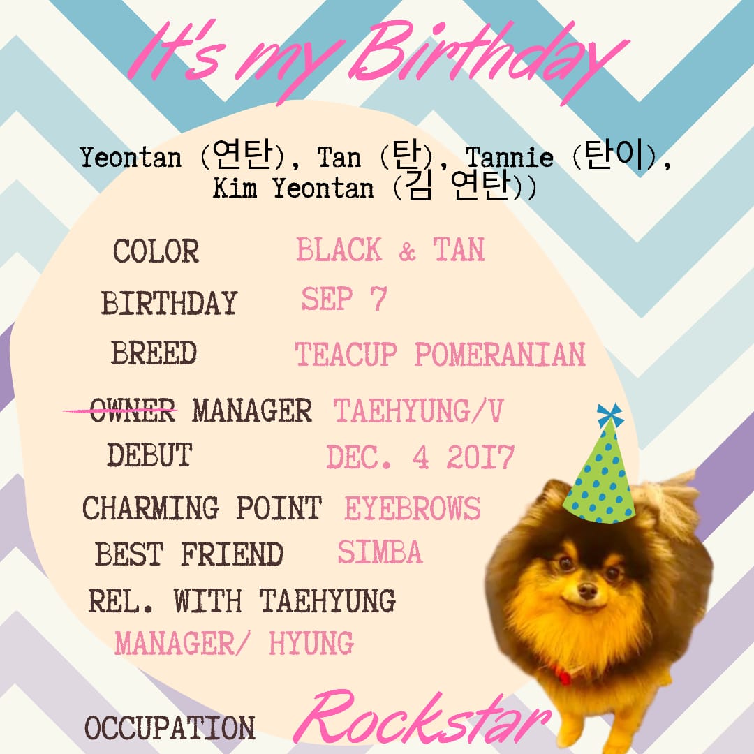 Yeontan celebrates birthday on September 7. Black and tan Teacup Pomeranian who rose to fame on social media platforms for being the pet of BTS member Kim Taehyung.